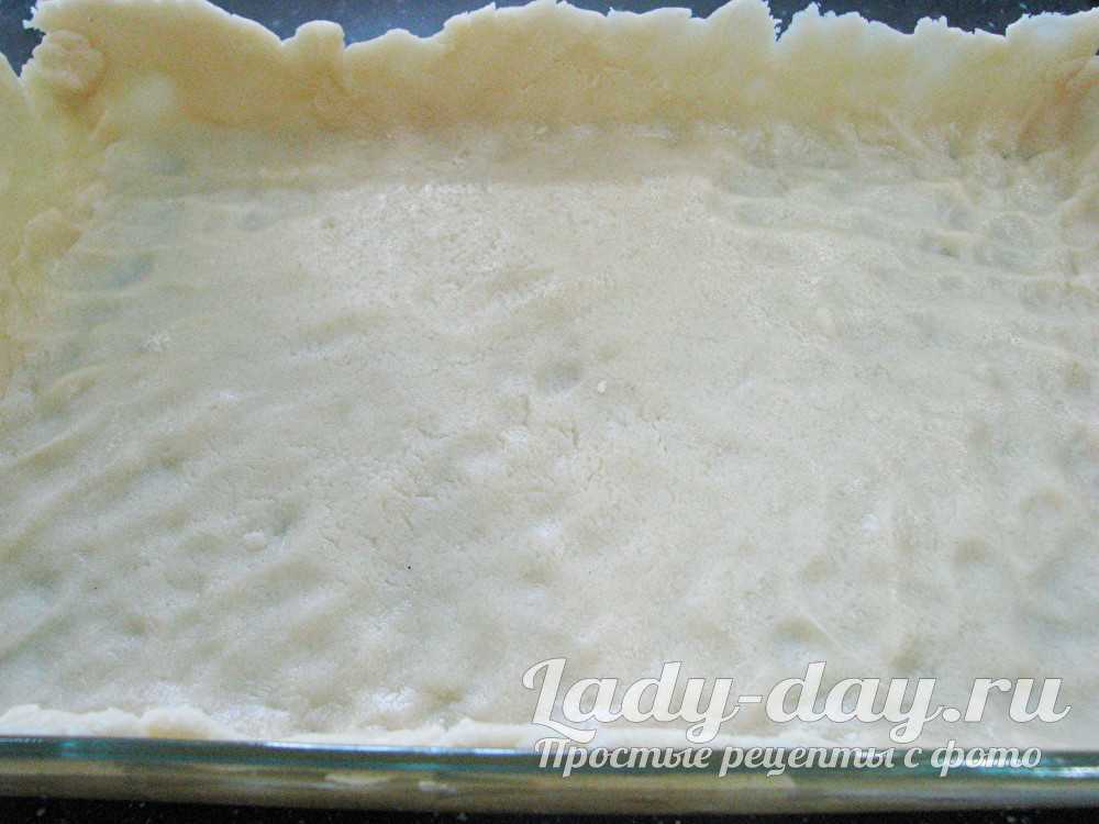 Достаем охлажденное тесто из холодильника, раскатываем его по размеру формы. Выкладываем в форму так, чтобы получились бортики.