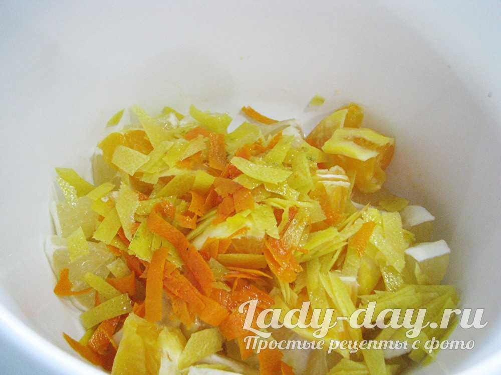 Нарежьте фрукты на небольшие кусочки, положите в чашу. Цедру порежьте ножом и отправьте к мякоти.