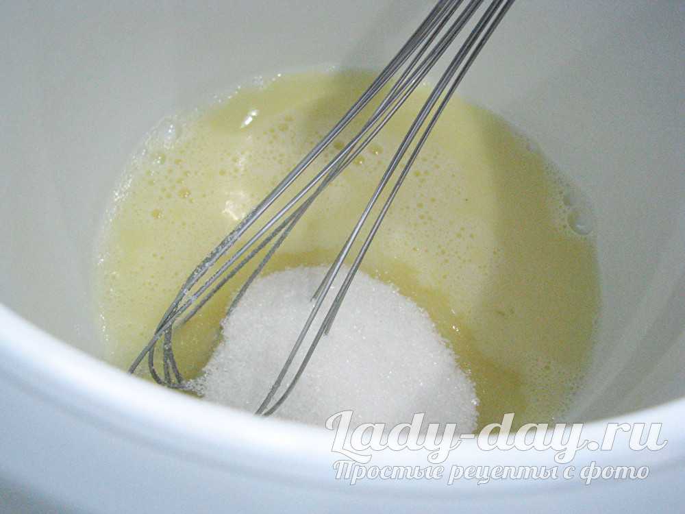 Охладите яйца, засыпьте сахаром, взбейте миксером на высокой скорости в пышную пену. Масса должна увеличиться в объеме вдвое.