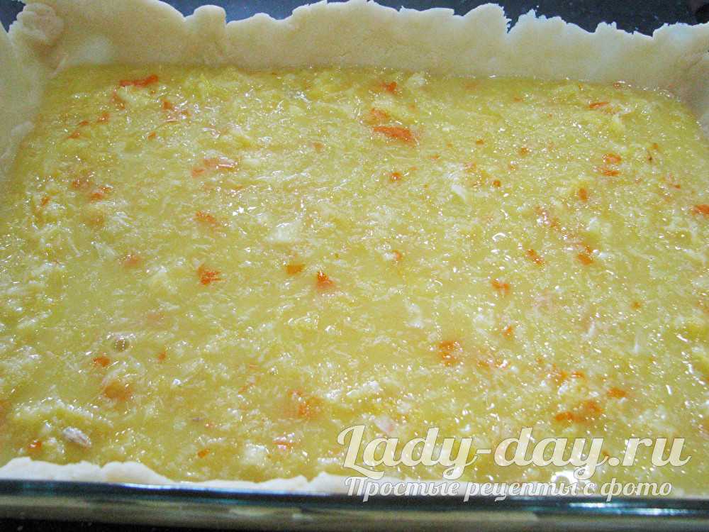 - Затем заливаем цитрусовую начинку и разравниваем ее по всей поверхности пирога ровным слоем одинаковой толщины.