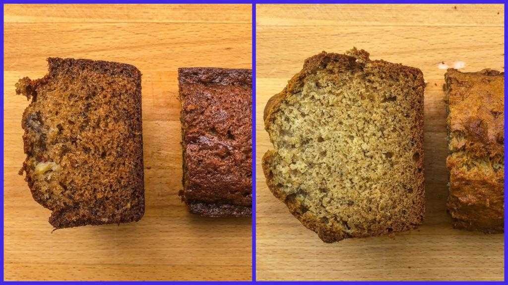 Что же будет, если не доложить муку? В этом случае возникают проблемы. Пирог становится влажным, более сочным, но при этом часть его карамелизируется. Вершинка также может деформироваться или осесть (фото слева).