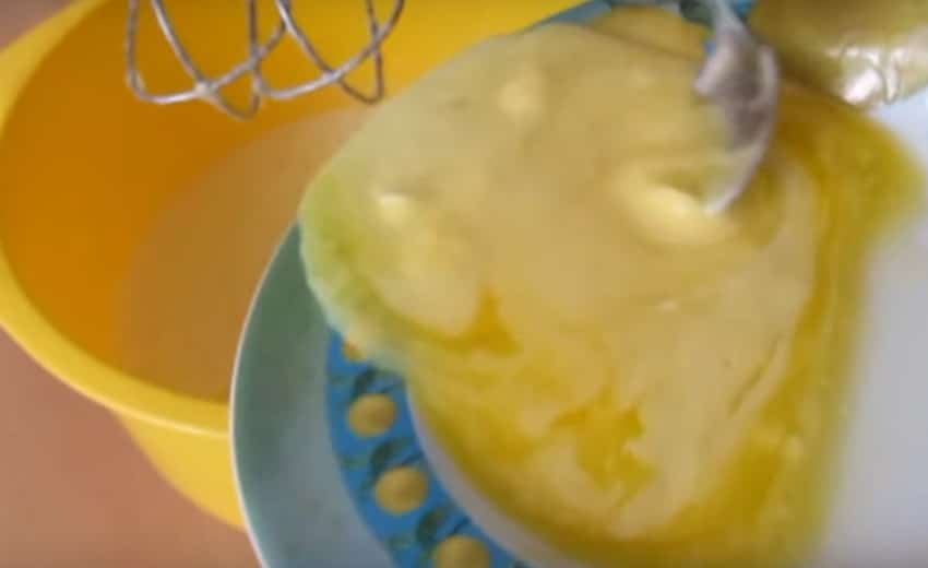 - Теперь необходимо куриные яйца разделить на желтки и белки, затем белки взбить с ванилином и солью, а желтки соединить с маслом, постоянно помешивая.