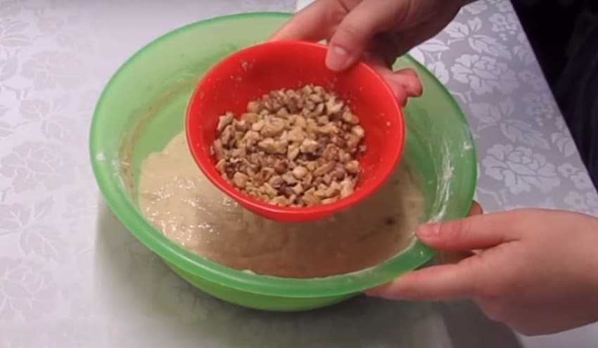 3. Орехи подсушите, слегка порубите ножом и добавьте в тесто.