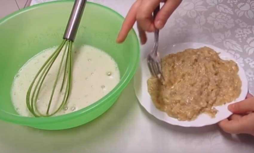В глубокой тарелке размять банан вилкой. Чтобы получить однородную текстуру, можно воспользоваться блендером.
