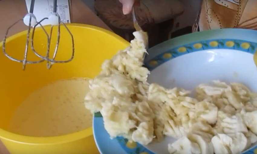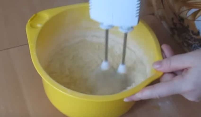 - Яйца добавлять к смеси по одному, взбивая тесто миксером на небольших оборотах.