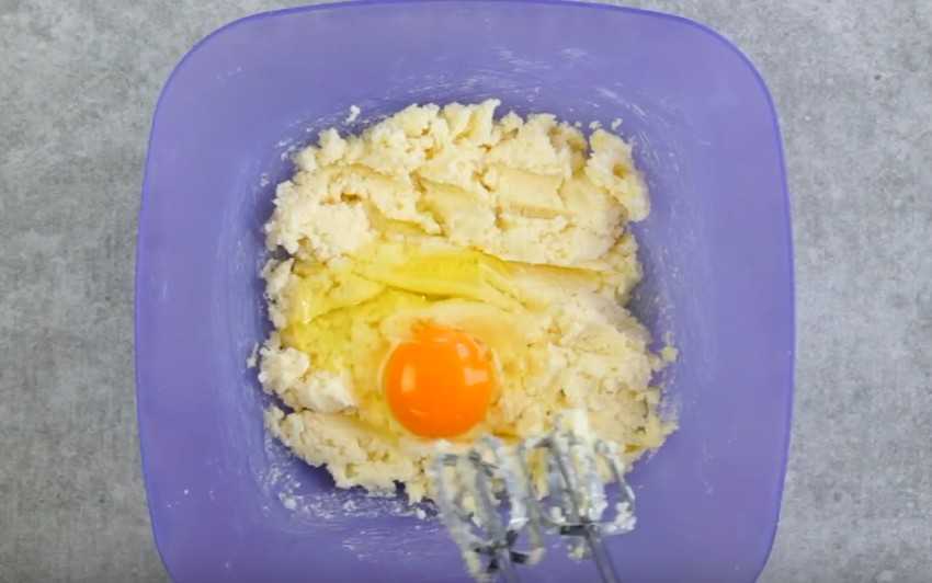- Взбить миксером яйцо, ванилин и творог. Добавить муку (постепенно), перемешать венчиком.
