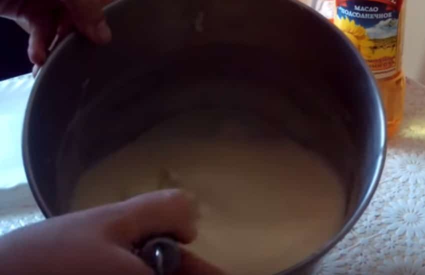 2. Влейте кефир, добавьте немного растительного масла без запаха. Аккуратно начните перемешивать ложкой.