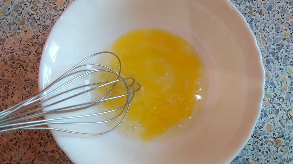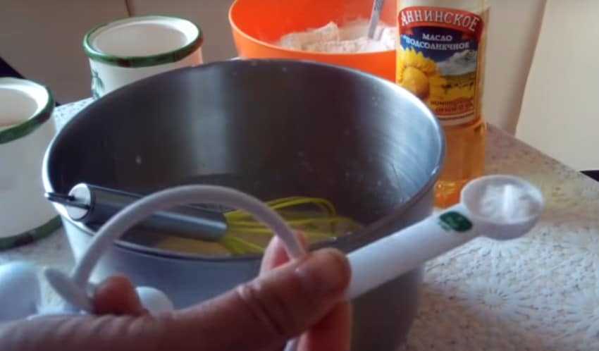 1. Необходимое количество куриных яиц разбейте в глубокую емкость, добавьте соль, третью часть необходимого количества сахарного песка и погашенную пищевую соду столовым уксусом. Воспользовавшись венчиком, хорошо перемешайте массу до однородной гладкой консистенции.