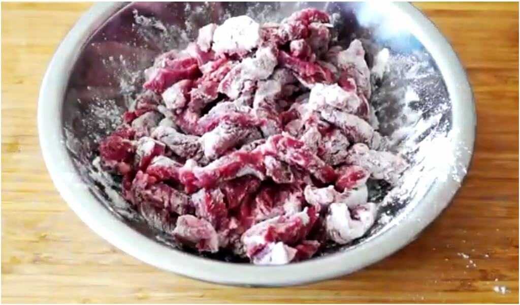 1. Вымойте говядину и нарежьте его брусочками толщиной примерно 1-1,5 см. Нарезать мясо лучше всего поперек волокон. Кусочки посолите, поперчите и приправьте кориандром.