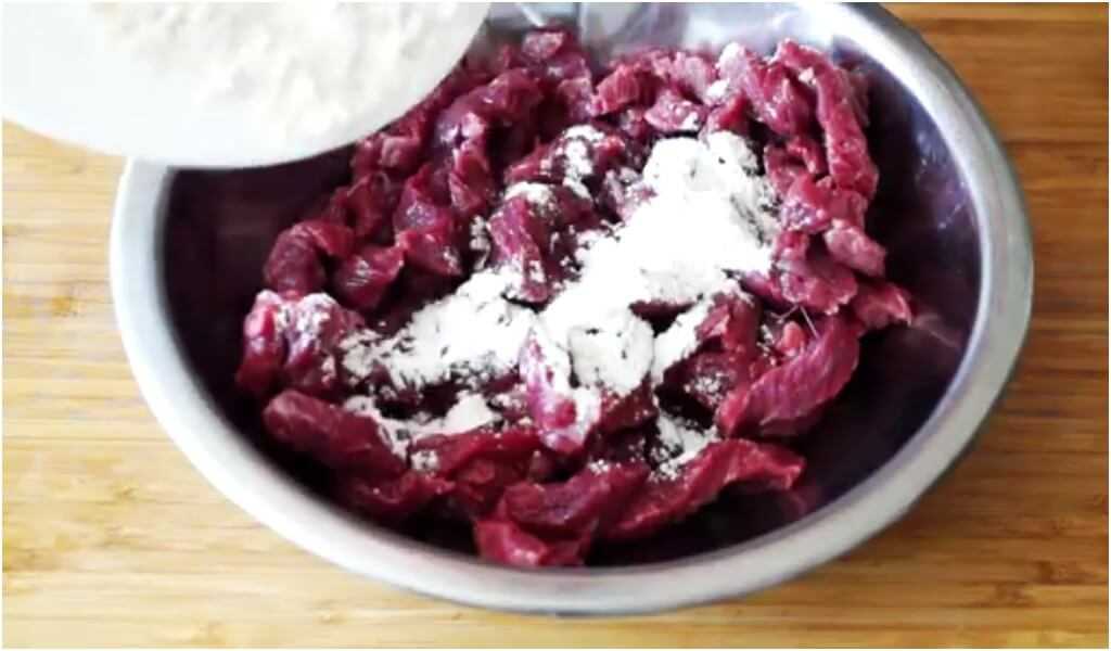 К нарезанному мясу добавляем полторы ложки муки и тщательно обваливаем мясо в муке. Кусочки, как бы покрывается тонкой, защитной, мучной, панировочной пленкой. Солим, перчим и отправляем на сковороду с хорошо разогретым подсолнечным маслом. Обжариваем на нем мясо небольшими порциями.