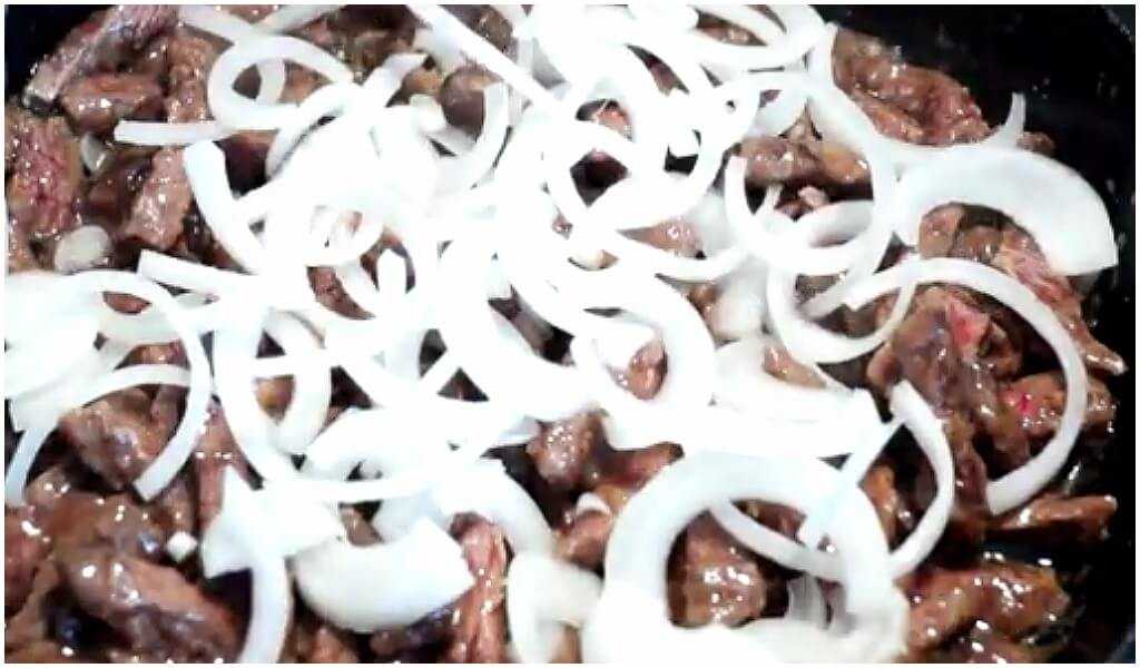 Можно лук пожарить отдельно до золотистого оттенка, минут 5 – 7, а затем соединить с говядиной. Все зависит от привычки и желания.