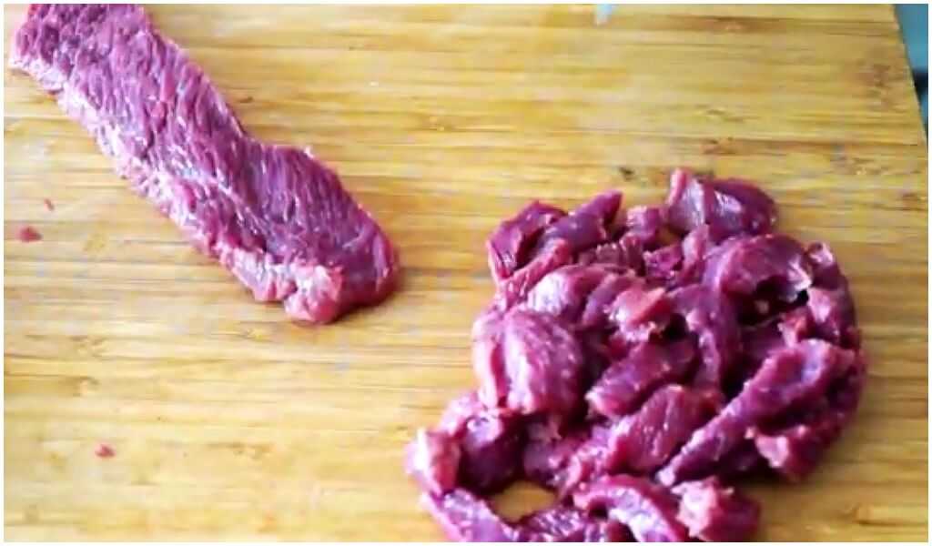 Сначала мясо нарезать на достаточно тонкие ломти. Перед тем как дальше нарезать мясо, его следует отбить. Так оно быстрее приготовиться и получится тоньше и мягче. По традиции и для лучшего сохранения вкуса мяса, его следует нарезать тонкой соломкой. Размерами получаемой нарезки примерно 05 на 0,5 на 5 см.