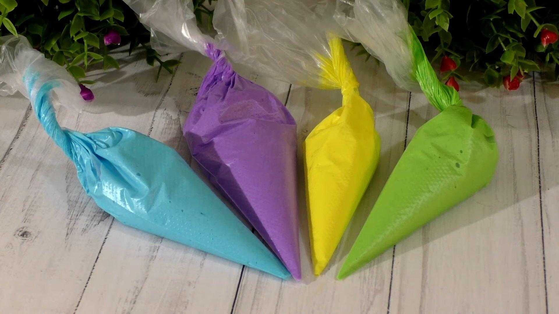 Выкладываем цветную глазурь в кондитерские мешки.