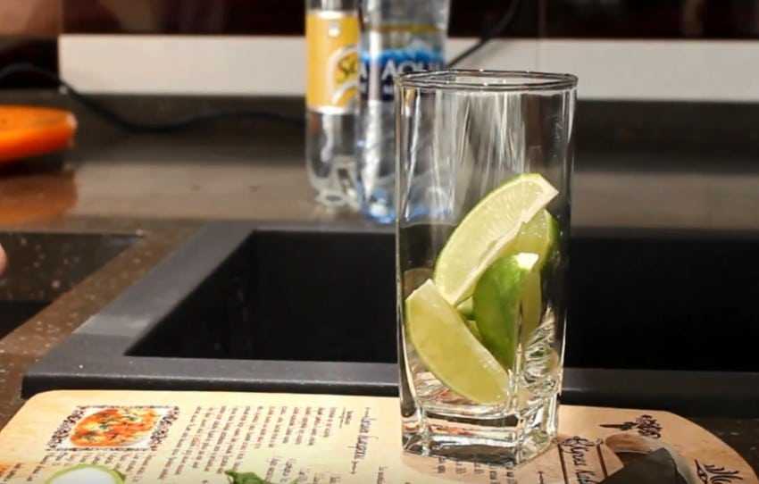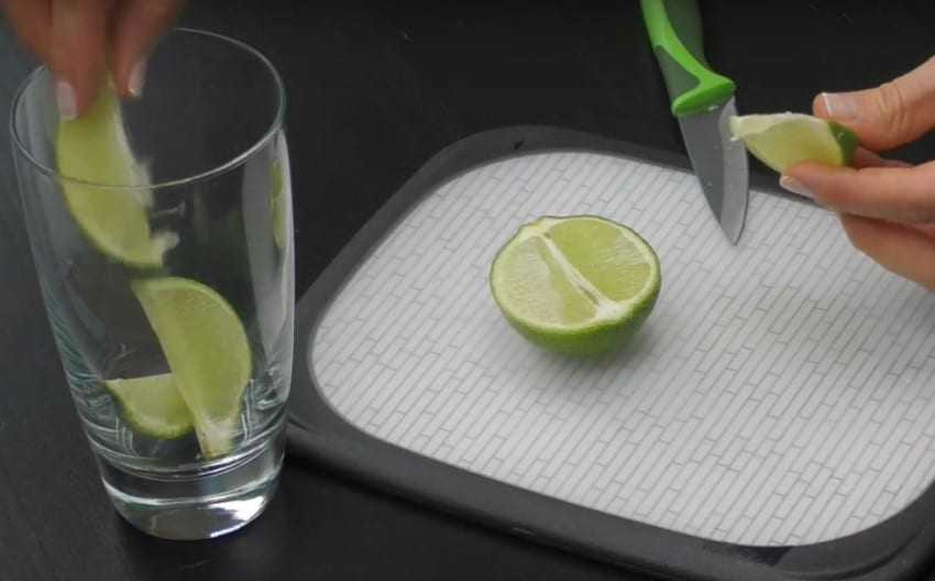 1. Половину лайма нарежьте на дольки и поместите в стакан.