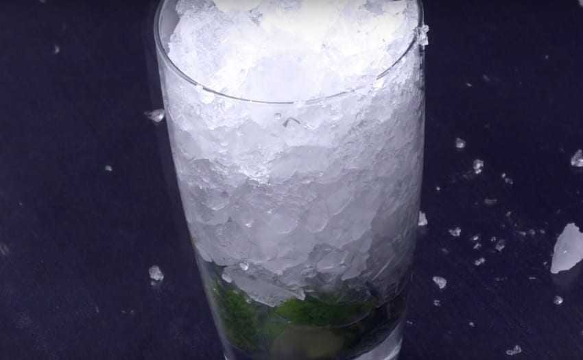 В оригинальном исполнении лед должен быть колотым, а лайм и мята тщательно перетерты с кристаллами сахара. Я ограничиваюсь кубиками из формочки. Если хотите делать правильно, поступайте так: