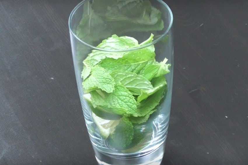 Мяту рвут на кусочки или измельчают зелень ножом, после чего хорошо разминают и отправляют в бокал.