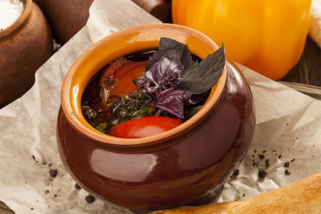 - Накрываем горшочки крышкой и отправляем в прогретую до 180 градусов духовку примерно на полтора часа (до мягкости мяса). Добавлять в емкости воду необязательно, так как за счет сочных сезонных томатов и остальных овощей образуется и так достаточно жидкости. Подаем блюдо, присыпав свежей зеленью.