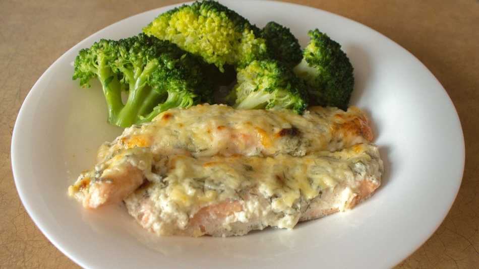 - Все смазать хорошенько сметанной, чтобы рыба получилась сочной. Если брать майонез, тогда следует учесть, что он немного соленный. Поэтому горбушу стоит посолить меньше.