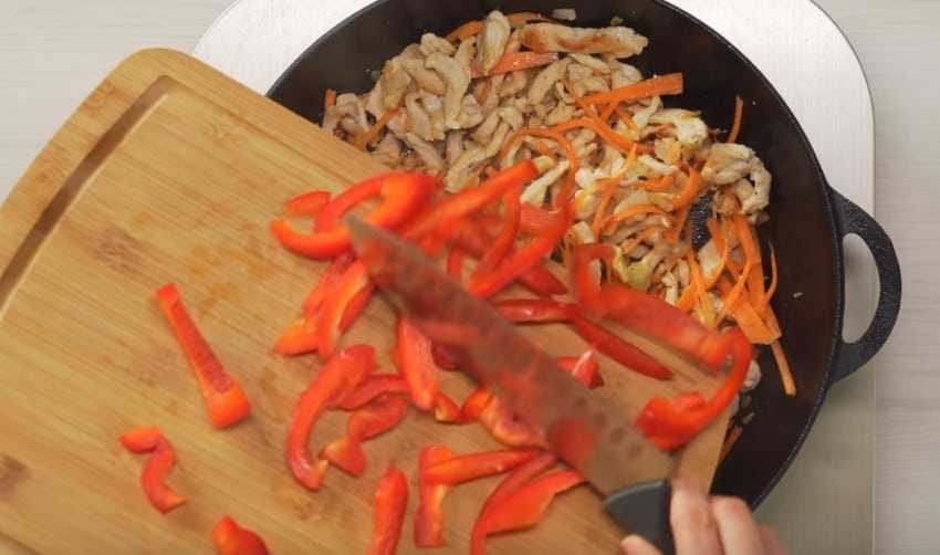 6. Тонкими полосками нашинкуйте сладкий перец. Отправьте его в сковородку с другими ингредиентами. Обжаривайте, помешивая, 1 минуту на среднем огне.