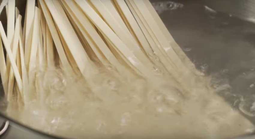 8. В подсоленной кипящей воде варите удон в соответствии с инструкцией на упаковке. Откиньте на дуршлаг, промойте холодной водой.