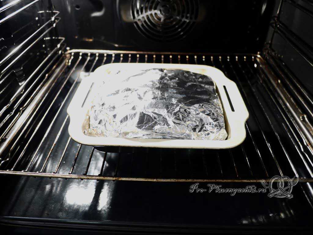 - Отправьте противень в духовку на 20 минут при температуре 180 градусов. После сбавьте режим до 150 градусов и продолжите готовить блюдо еще 1,5 часа.