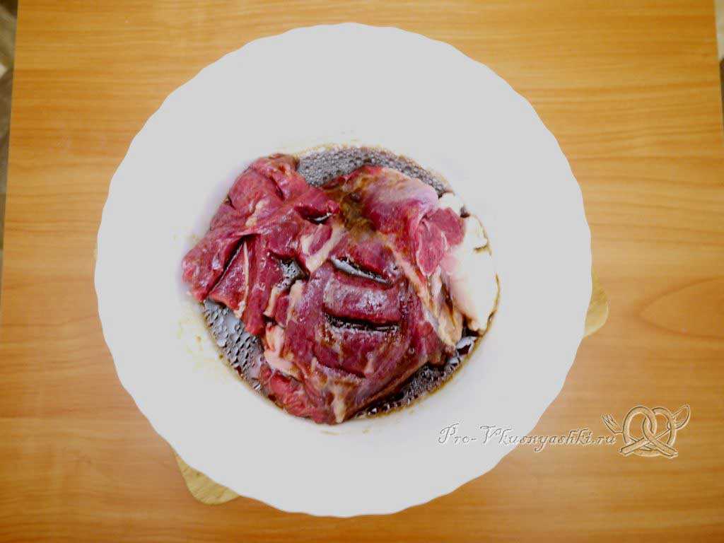- Положите мясо в маринад. Оставьте его при комнатной температуре на полтора — два часа либо замаринуйте вечером, определите в холодильник и держите там до утра.
