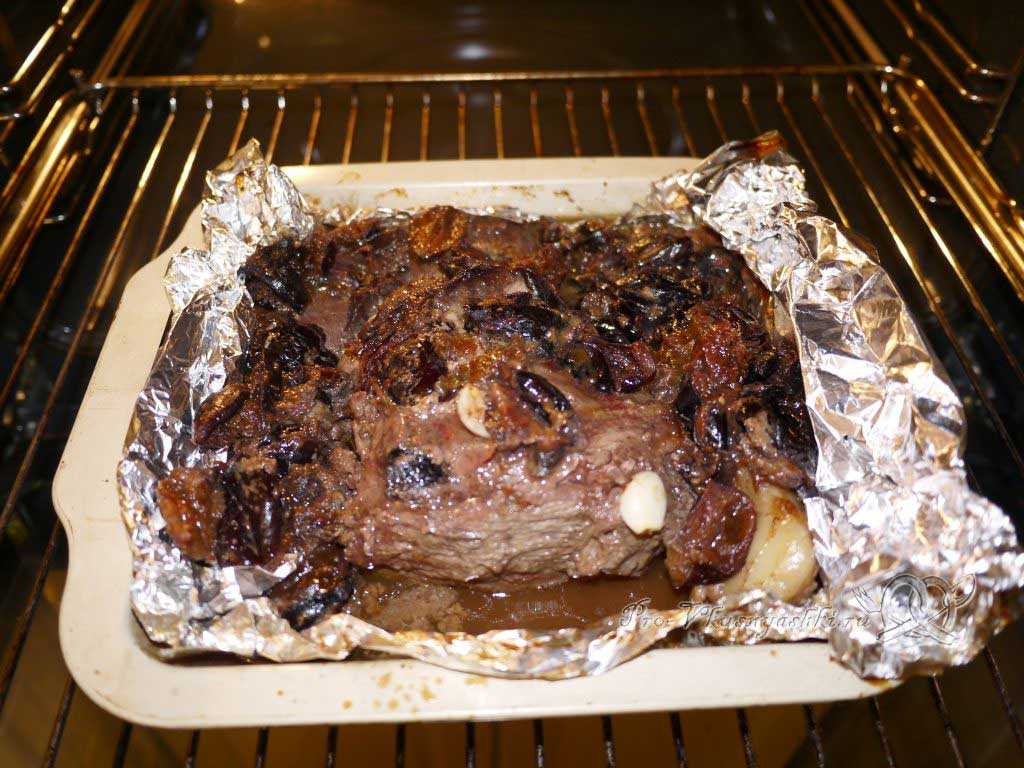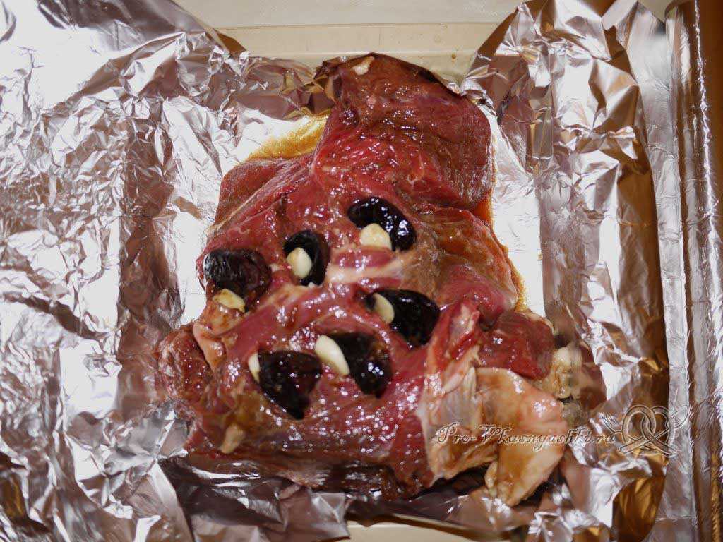 Поверхность формы для запекания накрываем листом фольги. Помещаем на нее маринованное мясо, в каждое отверстие которого вкладываем чернослив и чеснок.