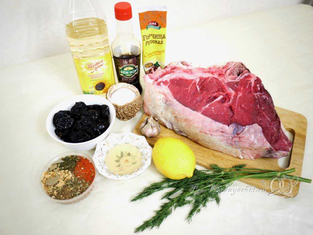- Подготовить все перечисленные ингредиенты. Говядину обмыть проточной водой, просушить бумажными полотенцами. Щедро натереть солью, черным перцем и любыми специями. Смазать маслом. Оставить на тридцать минут для маринования