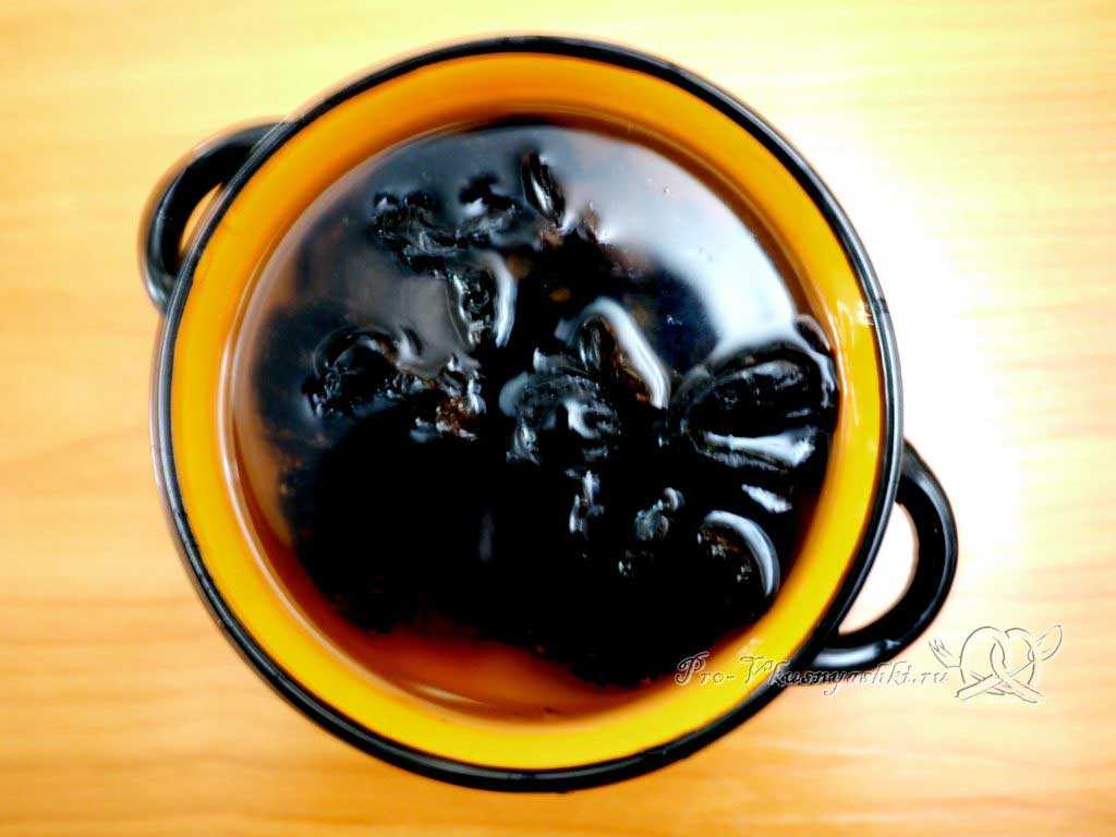 Чернослив заливаем горячей водой и оставляем набухать в течение 10-15 мин. Затем жидкость сливаем.