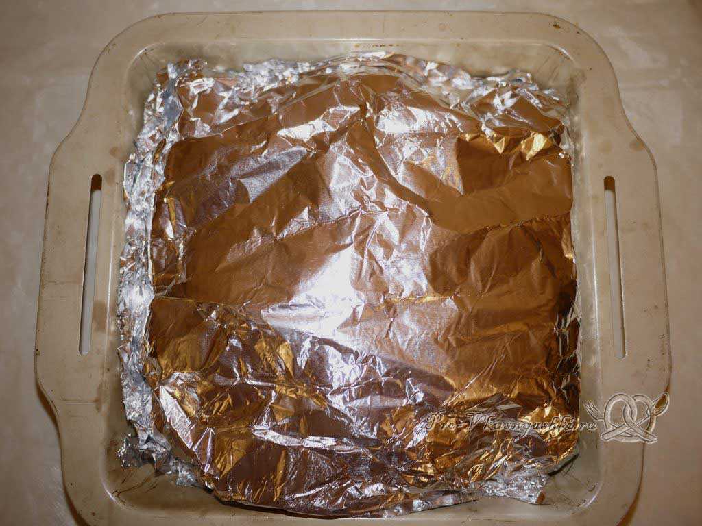 4. Хорошо промаринованное мясо достаньте из холодильника. Подготовьте большой лист пищевой фольги, его должно быть достаточно, чтобы завернуть мясо в два слоя, таким образом сок не вытечет из мяса.