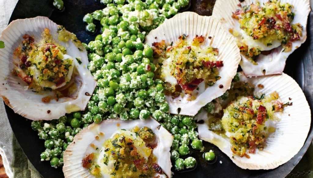 - Отделить гребешки от раковин и поместить в них смесь. Запекать в духовке при температуре 200˚C до румяной корочки.
