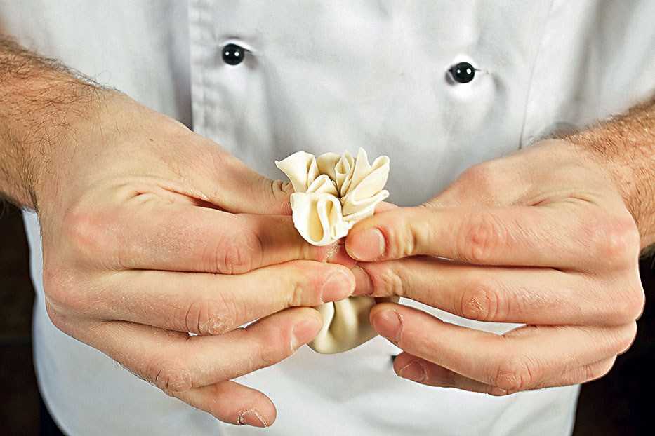 Все края складочек собираются вверху и соединяются между собой. Заворачивать нужно плотно, чтобы не было ни одного маленького расстояния, откуда мог бы вытечь ароматный сок. Проделав эту операцию, Вы заметите, что в верхней части образовался «хвост». В классическом варианте его принято прищипывать и отрывать, но сейчас все чаще можно встретить, что он остается на месте;