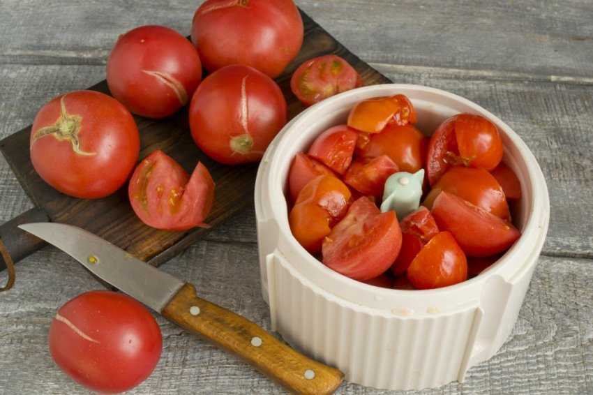 Помидоры нужно вымыть, удалить плодоножку, вырезать место у плодоножки. Нарезаем дольками чтобы было удобно пропустить через мясорубку.