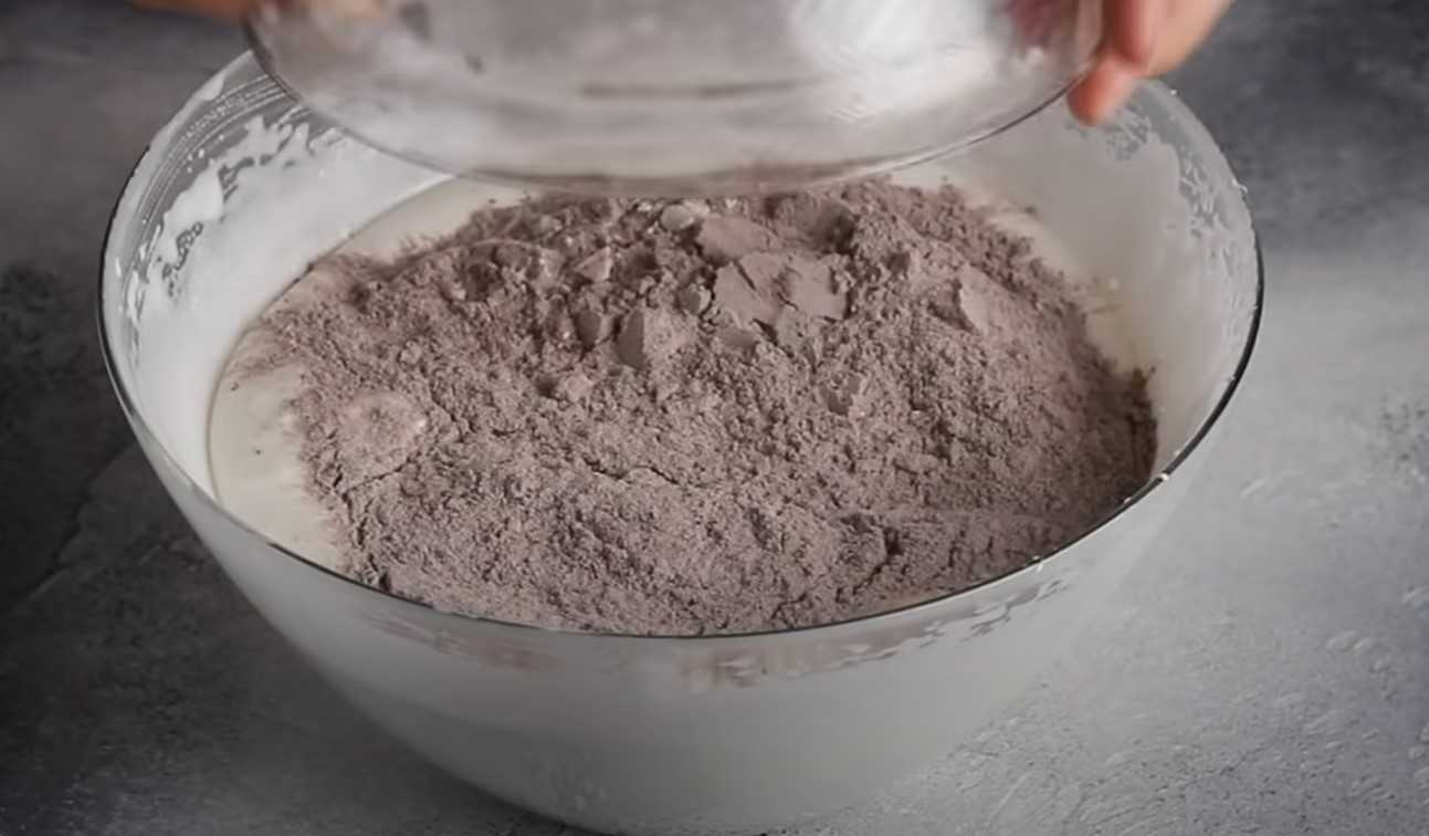 В два этапа добавляем сыпучие ингредиенты, перемешивая при этом лопаткой, снизу вверх.