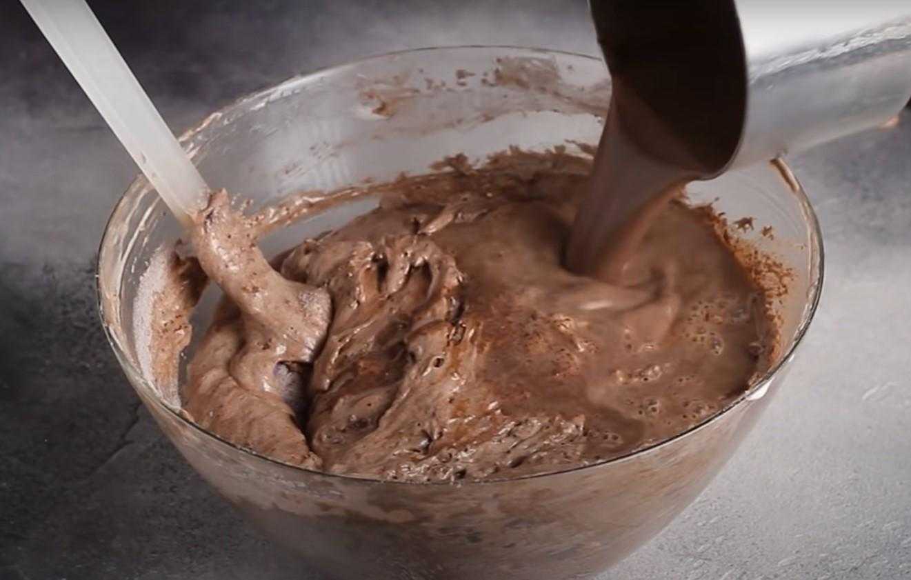 Когда сухие ингредиенты вмешались, вливаем шоколадную масляно-молочную смесь. Снова с помощью лопатки перемешиваем до получения однородной массы.