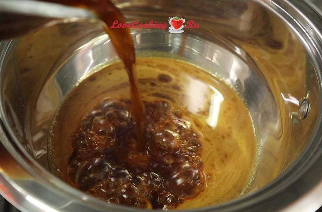 Вливаем кофе осторожно, тонкой струйкой, при этом перемешивая тесто