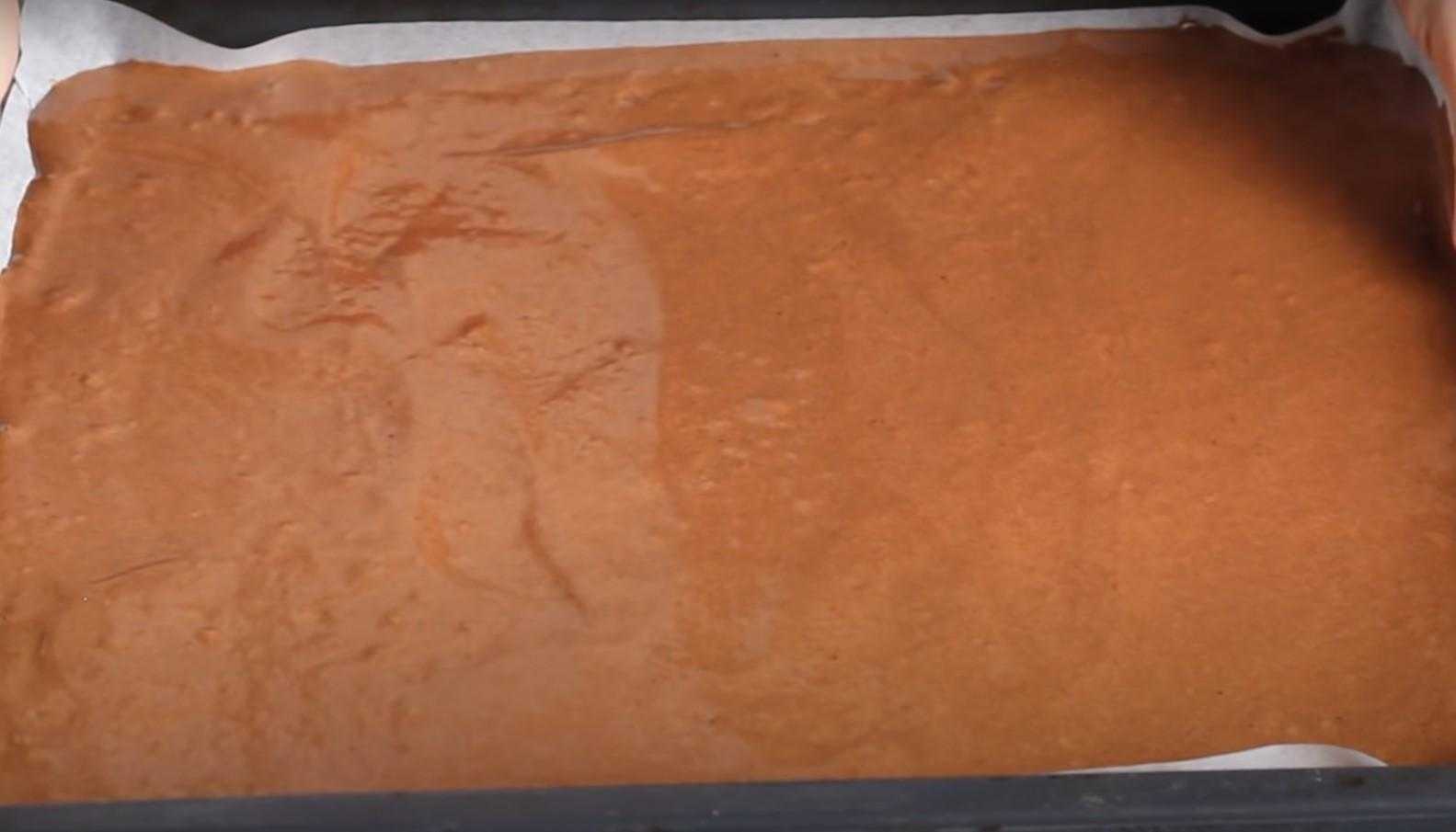 Готовое тесто выливаем на противень, застеленный пергаментной бумагой. Распределяем равномерным слоем и отправляем в духовку. Режим выпекания 180 градусов, 10-12 минут.