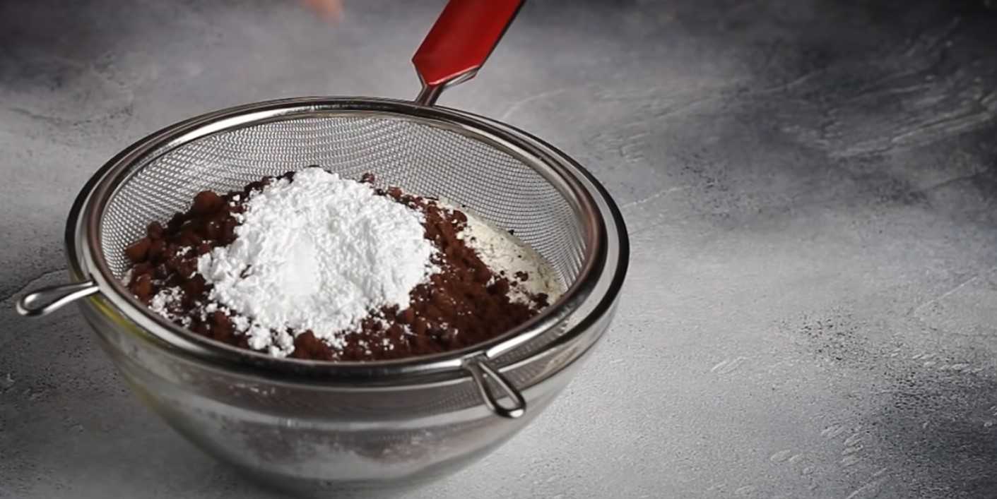 Муку, какао и разрыхлитель просеиваем через сито в глубокую емкость.