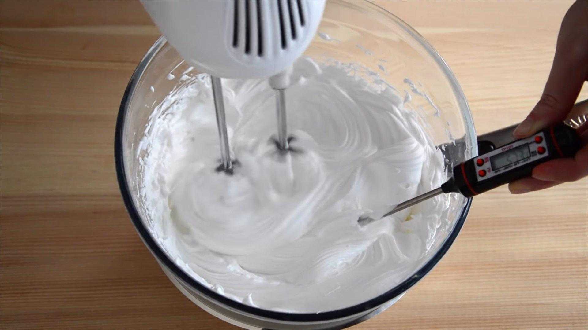- Включив миксер на низкую скорость, требуется взбивать яичную массу, постепенно добавляя в нее сахарный сироп. Обрабатывать крем прибором потребуется до тех пор, пока он полностью не остынет.