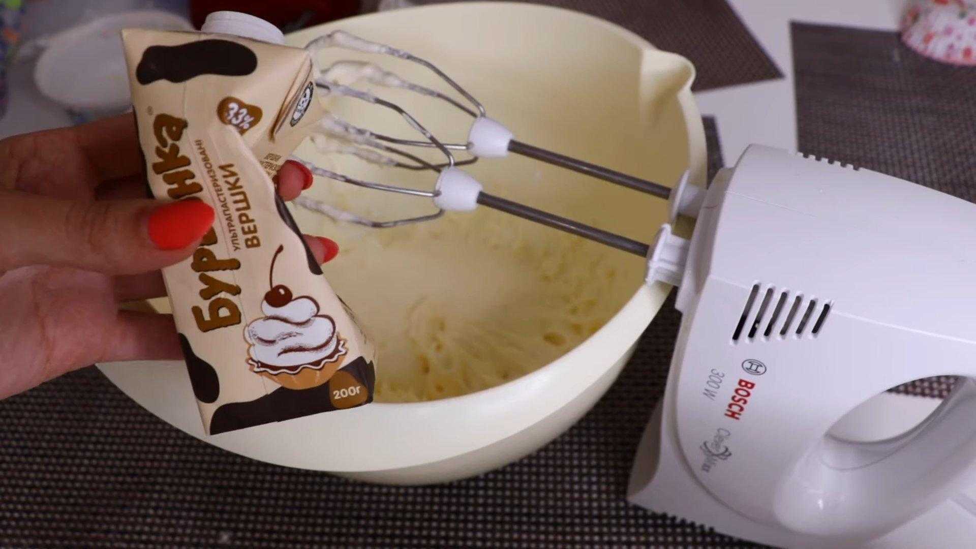 Вливаем охлажденные сливки и продолжаем взбивать крем еще несколько минут.