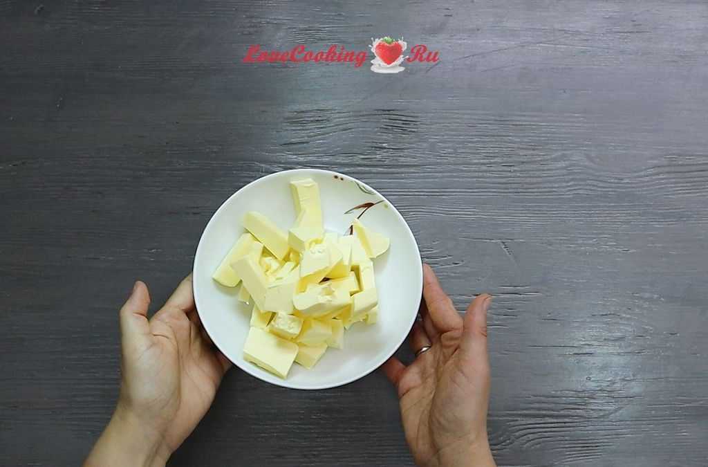 Сливочное масло достаём из холодильника, нарезаем на кубики и оставляем при комнатной температуре.