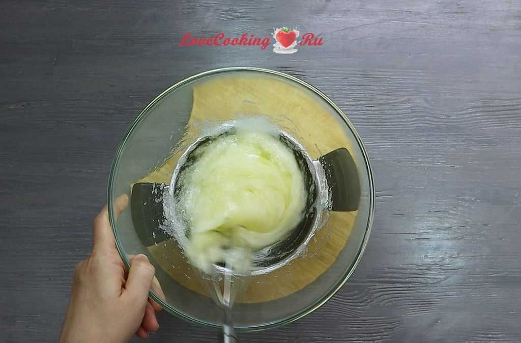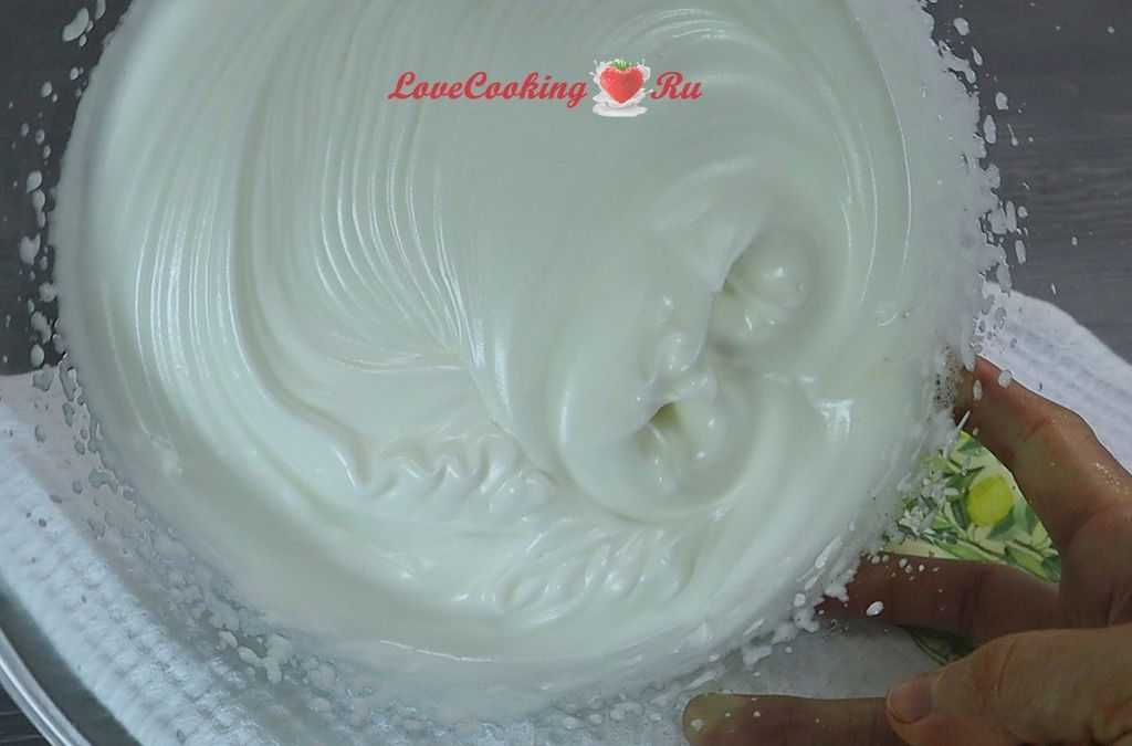 Делайте это осторожно и тонкой струйкой. Во время вливания сиропа в белки, миксер продолжает работать на максимальной скорости.