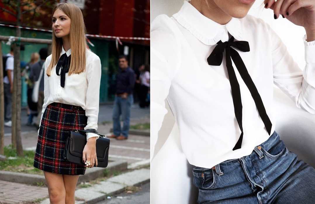 Сочетание белой блузы с черным бантом так напоминает школьные годы! Да, этот образ больше подойдет совсем юным девушкам – до 20 лет. Например, на это может указывать волнистый ворот блузы. Сочетание белой блузы и черного банта является классическим.