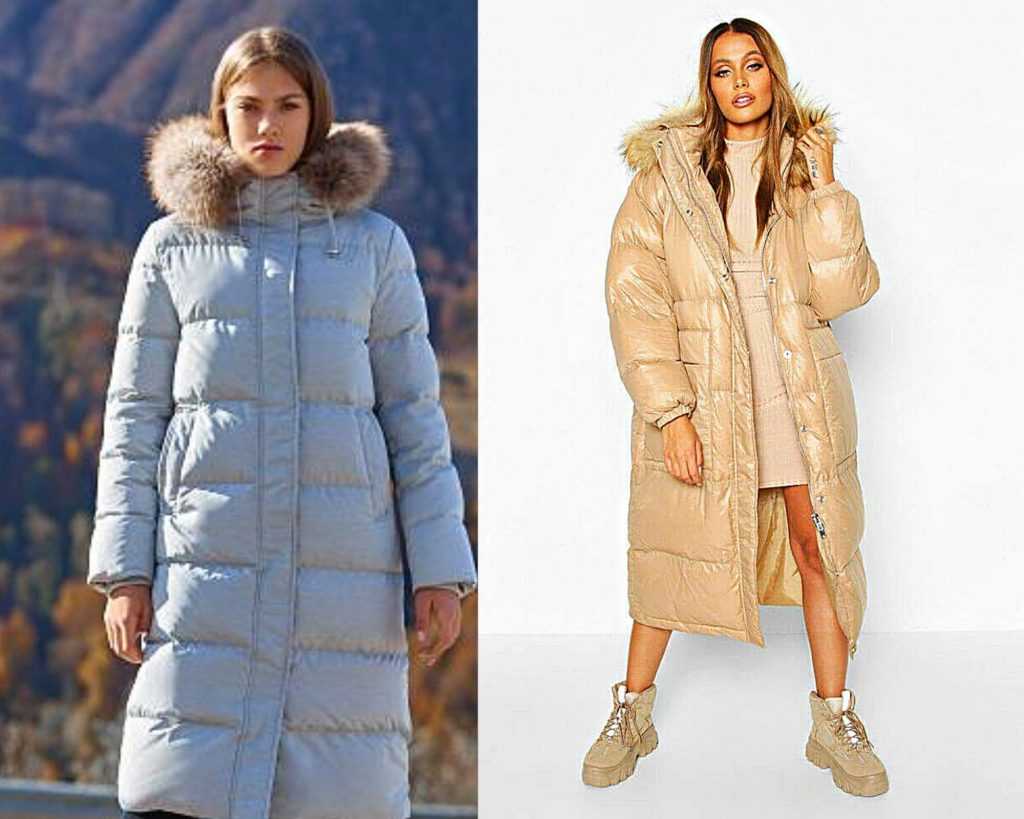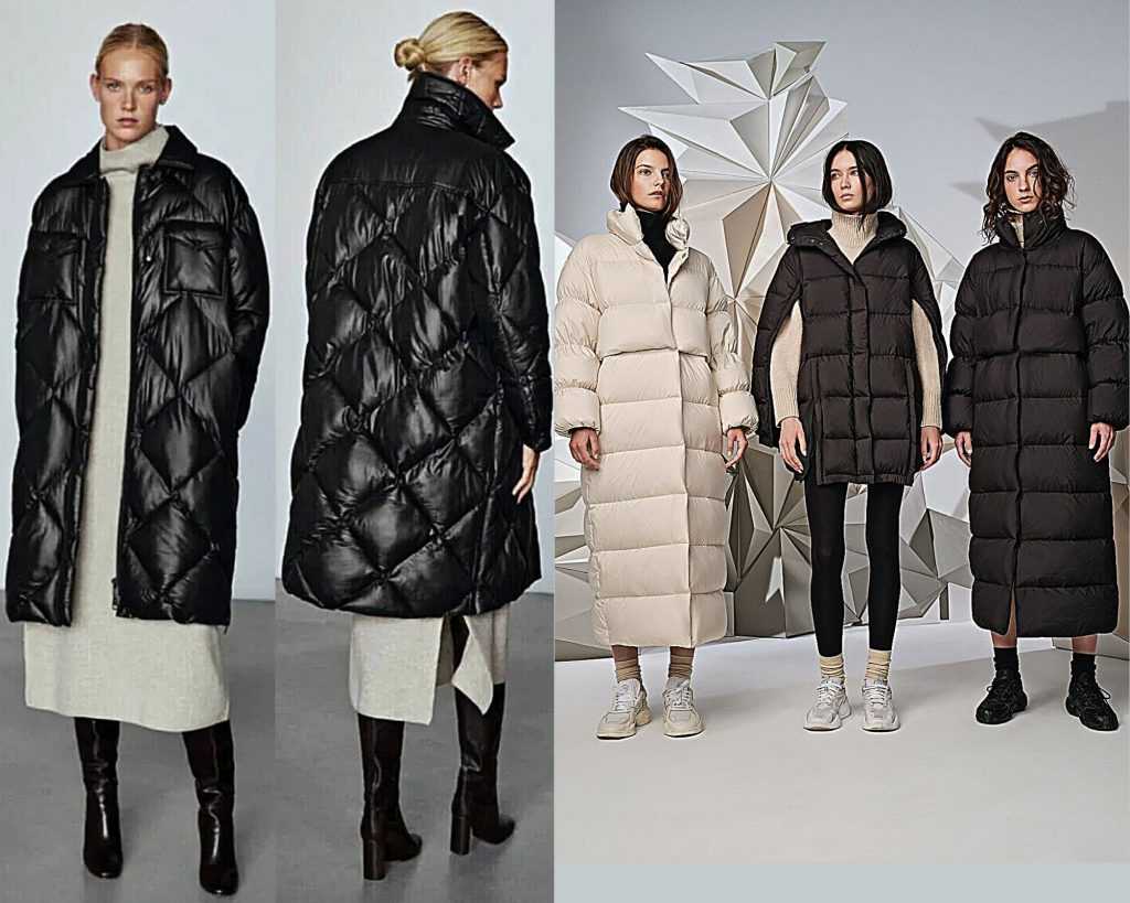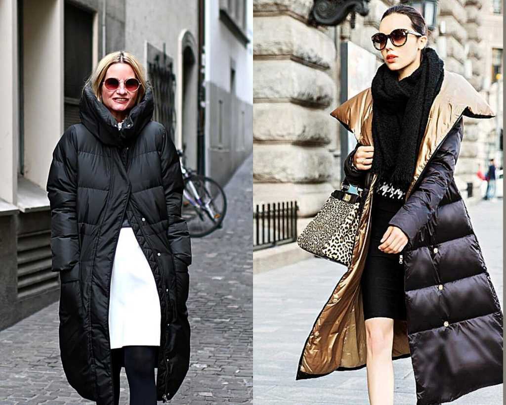 Если ваш любимый длинный пуховик из блестящей глянцевой ткани, то можно выбрать немного ярких деталей в виде шапочки, сумочки, массивных дутышей. Они добавят «космического» эффекта. Цветные плотные колготки, тон в тон повторяющие оттенок верхней одежды, еще и усилят его.