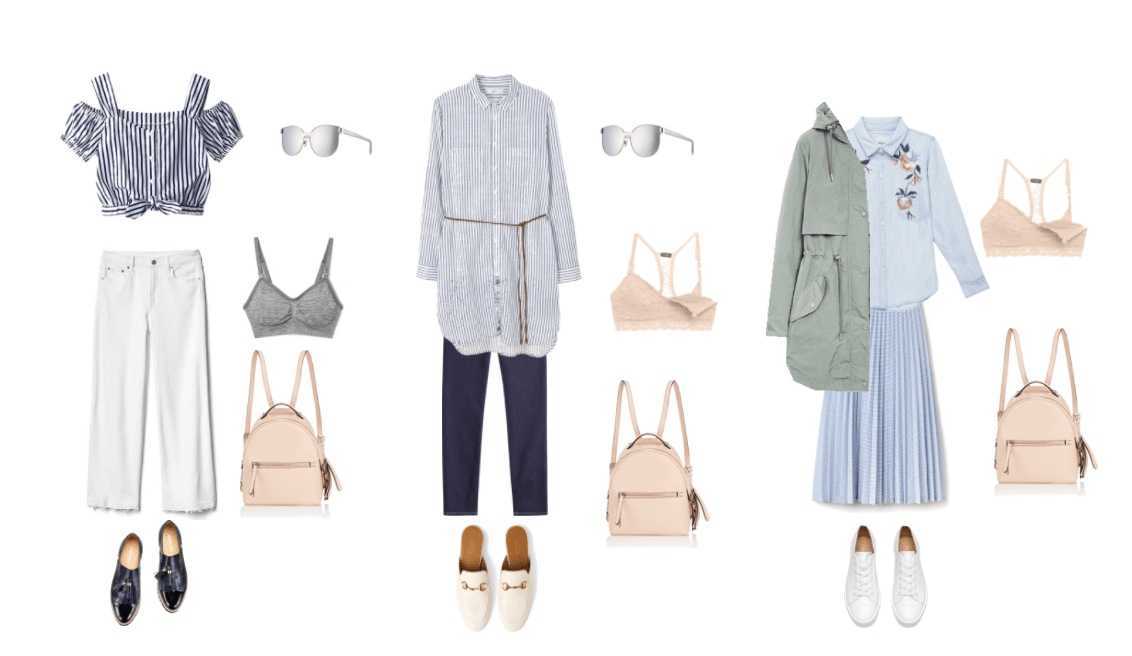 Итак, в капсульный гардероб девушки вошли: тренч, блейзер, белое платье-рубашка, джемпер, полосатый свитер, джинсы скинни, кожаная юбка, блузка, твидовый жакет, юбка-карандаш, чёрное маленькое платье, брюки. Кроме того, использовались три сумки и три пары обуви.