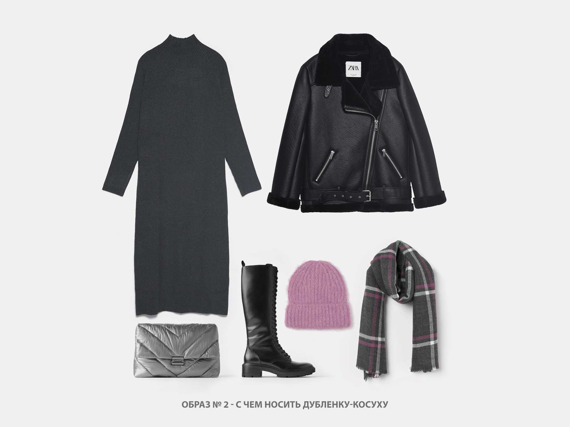 Всем любителям неформального стиля гранж обязательно нужно присмотреться к черной дубленке-косухе. С ней вы можно создавать просто невероятно стильные и актуальные образы. На втором фото за основу взято серое теплое платье из плотного трикотажа, которое является отличной базой и которое не даст вам замерзнуть зимой. Грубая обувь на толстой тракторной подошве со шнуровкой идеально подходят сюда стилистически. Чтобы немного смягчить образ в качестве головного убора можно добавить пушистую розовую шапку