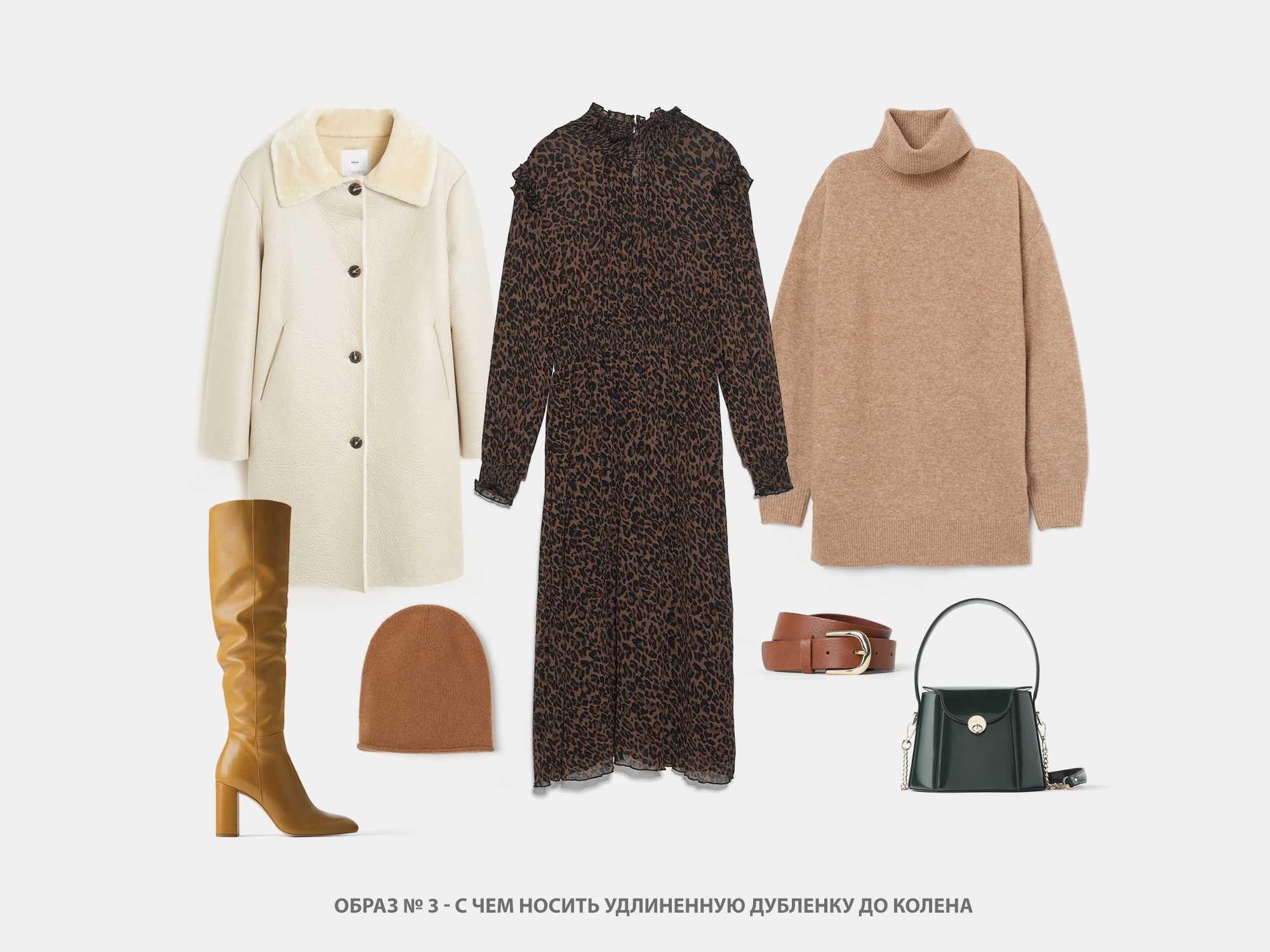 Удлиненная дубленка до колена — это ещё одна универсальная модель. Её можно сочетать как с брюками, так и с юбками и платьями разной длины. Если вам нравятся длинные шифоновые платья, не спешите убирать их на полку до наступления тепла. Ситуацию поможет решить простое стилистическое решение. К платью миди с леопардовым принтом можете добавить бежевый удлиненный свитер оверсайз. Чтобы подчеркнуть талию просто добавьте кожаный ремень. Аксессуары не должны быть одного цвета. Будет гораздо лучше, если вы возьмете за основу одну цветовую гамму и попробуете поиграть с оттенками, это всегда смотрится интересно и неизбито. Изюминку образу придаст акцентная сумка глубокого зеленого цвета, идеально сочетающаяся с теплой карамельно-молочной гаммой комплекта. Удлиненная женская светлая дубленка в данном случае прекрасно дополняет получившийся образ.