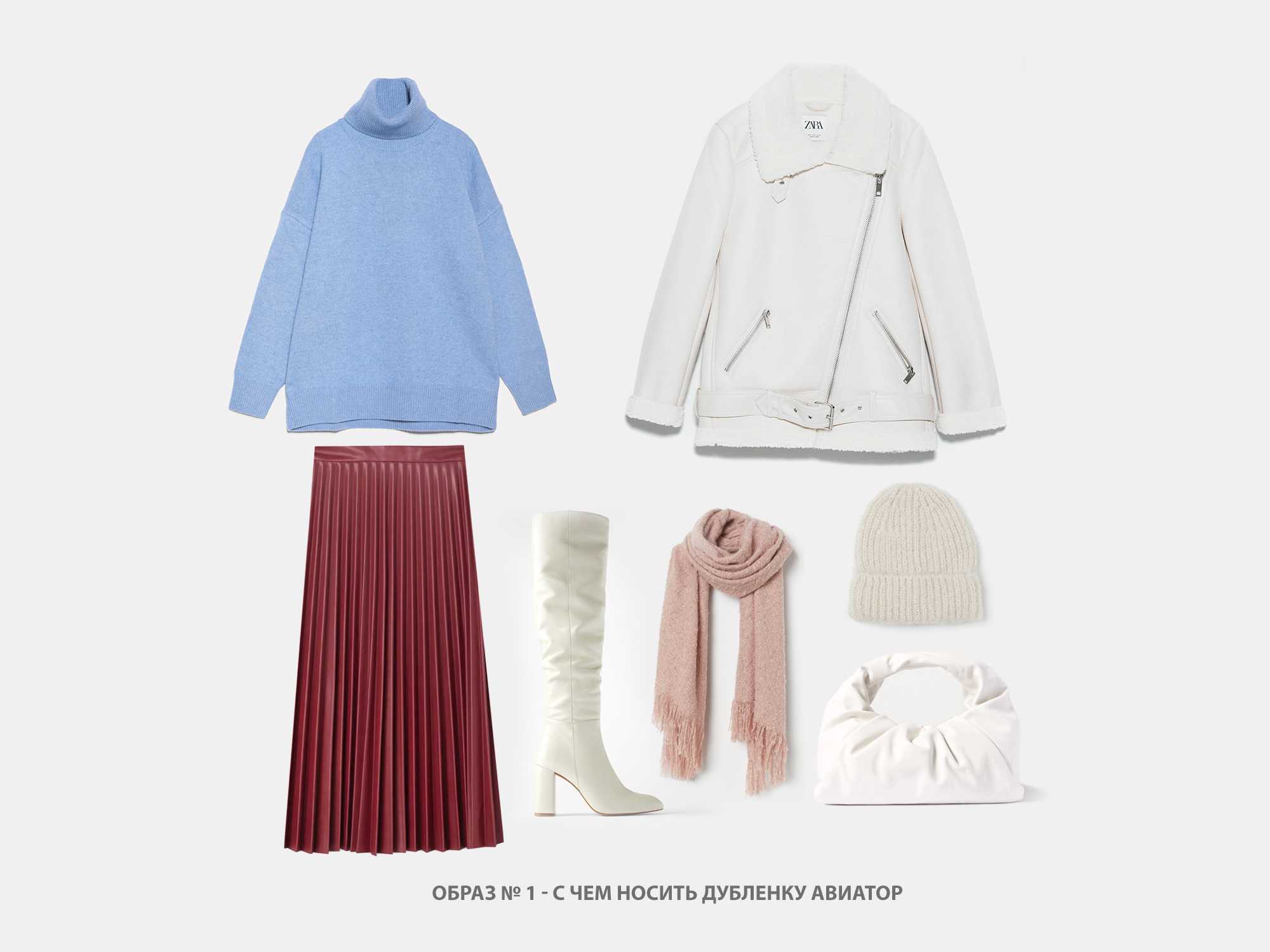 Женская дубленка авиатор — это та модель, с которой вы без труда сможете создать образ в любом стиле и она туда прекрасно впишется. Давайте покажу вам это на примере светлой дубленки, с которой мы создадим уютный зимний образ в романтическом стиле. За основу образа возьмем трендовую красную юбку плиссе и добавим к ней голубой объемный свитер с горлом. Сочетание этих цветов уже само по себе яркое, поэтому обувь и аксессуары добавим белого и около белого цвета, чтобы не смещать акцента с цветных элементов образа. Только немного добавим цвета шарфу, цвет которого красиво сочетается с цветом юбки, оттеняя красный цвет. Как вы видите по фото, аксессуарам мы добавим яркости за счет их формы и фактуры. Мягкая сумка актуальной формы и высокие сапоги с широким голенищем отлично вписываются в наряд. Всё получается мягкое, плавное, без жестких линий, идеально для зимы.