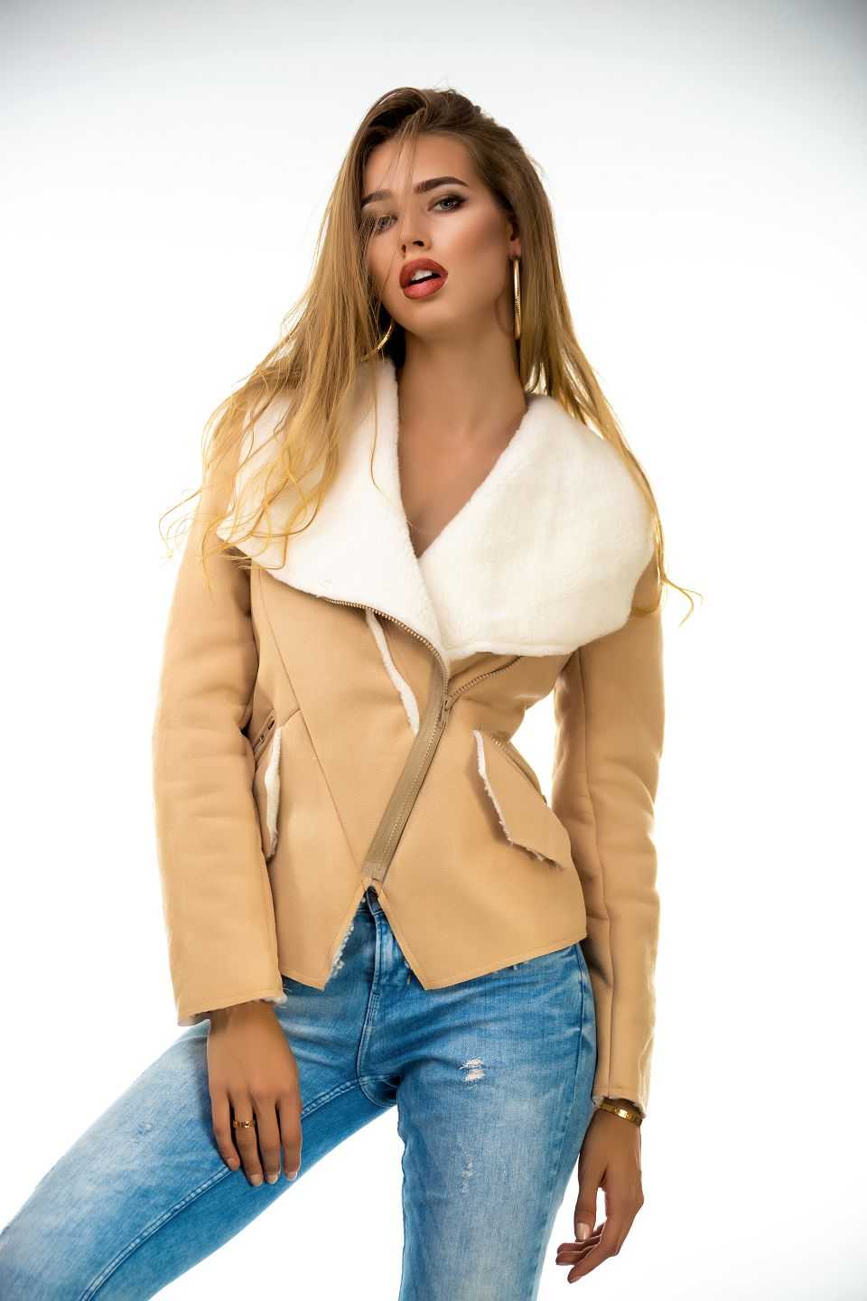 Отличительная особенность этой грубоватой модели – ее объемный воротник, а также косая молния. В некоторых моделях воротник настолько велик, что вы даже сможете отказаться от шапки. Такая дубленка очень универсальна и позволяет создавать множество разнообразных образов. Она прекрасно сочетается и с леггинсами, и с широкими брюками.