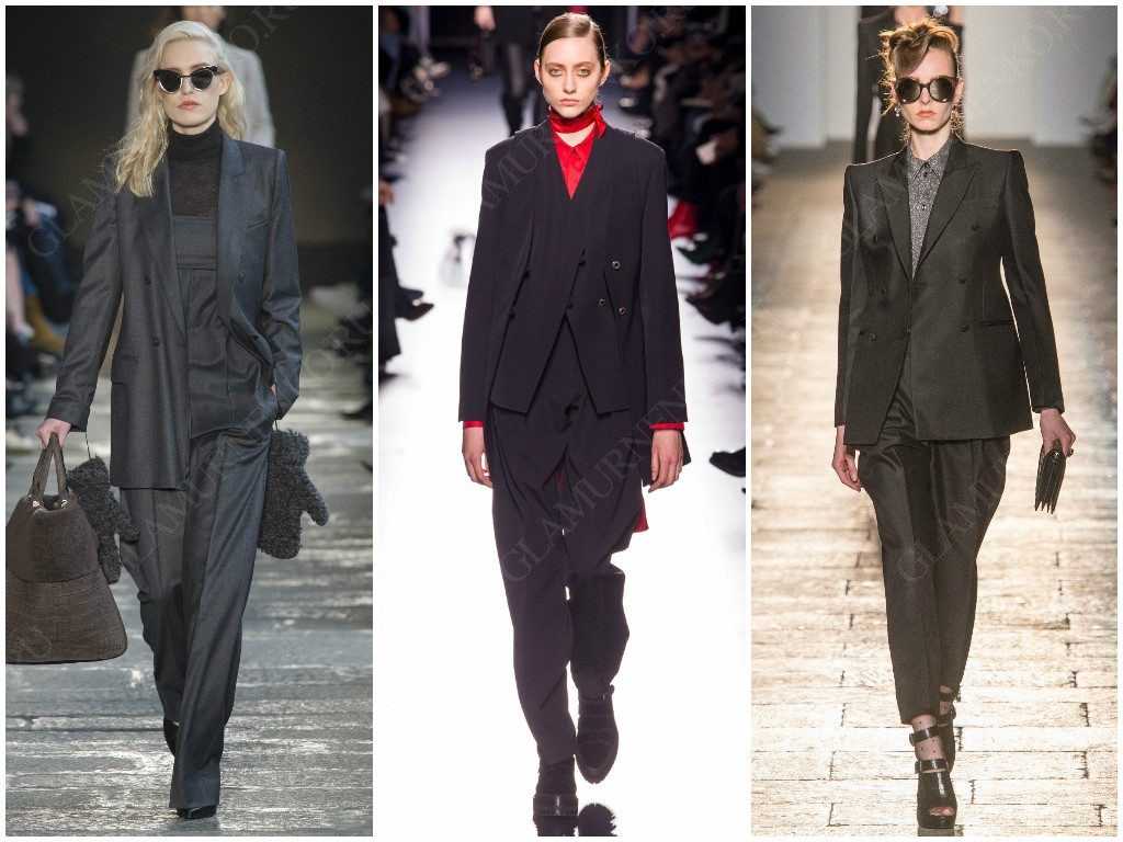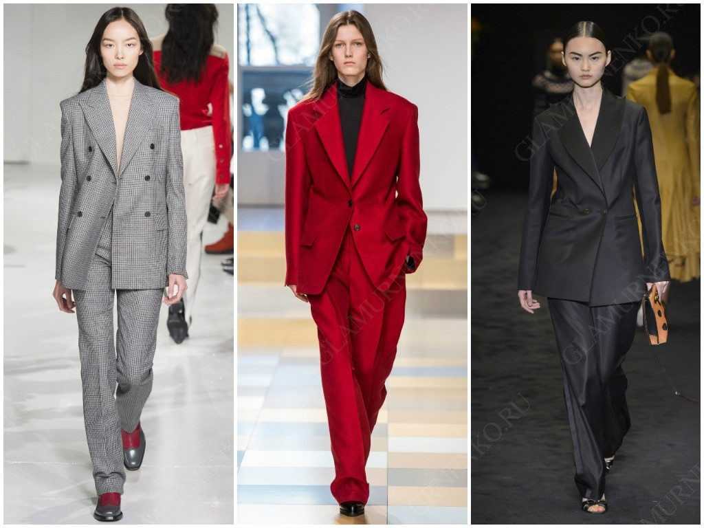 Самые смелые модницы могут попробовать нестандартный крой брючных костюмов. Dolce&Gabbana презентовали костюм с кроп-пиджаком и брюками на низкой талии, а Sportmax — бежевый комплект с объемными рукавами. Дизайнеры Etro увлеклись этническими узорами из костюмной ткани, а Jil Sander дополнил привычный силуэт жакетов необычным воротом. Показ MM6 Maison Margiela и вовсе перенес зрителей в сказочный мир. На подиуме предстал приталенный веревочным ремнем костюм, будто бы выполненный из бумаги, и жакет с украшением в виде третьего рукава.